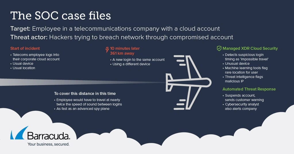 They then appeared to travel a distance of 361 km, roughly 225 miles, at nearly twice the speed of sound before logging in again, according to the data reaching Barracuda Managed XDR’s automated detection systems.